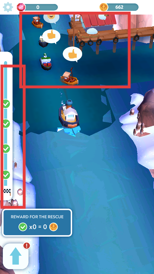 2、點擊屏幕,駕駛船只在河道中前行,撞擊冰塊,能獲取金幣,還會遇到其他船只,要靈活操作,持續推進救援進程。