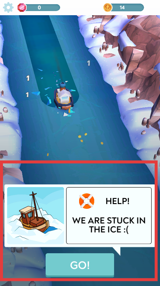 1、進入游戲,有看到有船只被困在冰里的求助提示,點擊GO按鈕,駕駛自己的船去執行救援任務,開啟這段救援之旅。