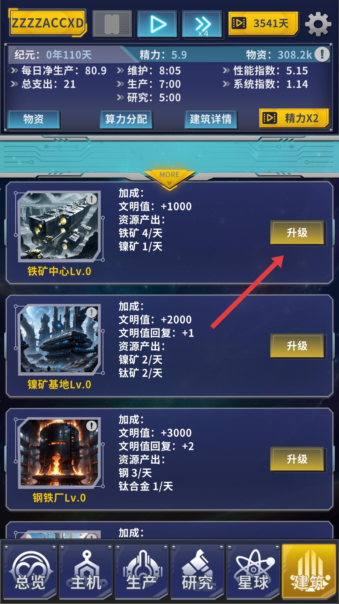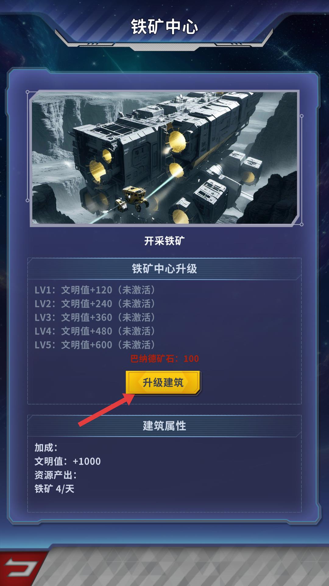 3、在建筑界面,找到想要升級的建筑,如鐵礦中心,點擊其對應的升級按鈕,可提升建筑等級,增加文明值和資源產出。