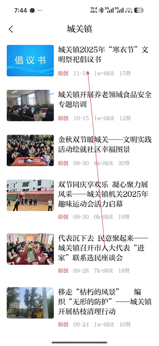 3、在城關鎮頁面選擇其中一條資訊,比如寒衣節文明倡議書,點擊進入詳情頁,查看該倡議書的發布時間及閱讀量等信息。