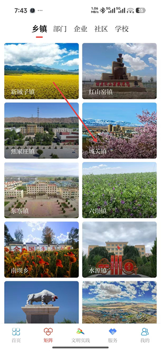 2、登錄后進入矩陣頁面,選擇鄉鎮分類,瀏覽展示的各鄉縝選項,找到城關鎮并點擊進入,查看該鄉鎮發布的各類資訊內容。