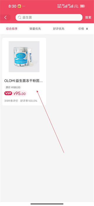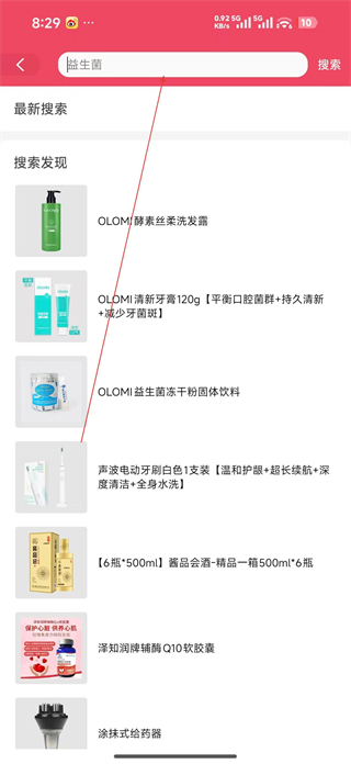 2、登錄后進入搜索頁面,在搜索框輸入關鍵詞,比如益生菌,點擊搜索按鈕,即可查看相關商品列表,找到目標商品。