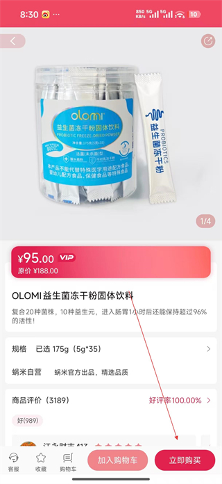 3、在商品列表中選擇目標商品,比如OLOMI益生菌凍干粉,點擊進入商品詳情頁面,查看價格規格等信息及商品評價。