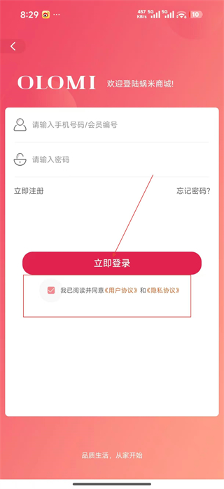 1、打開蝸米商城軟件,進入登錄頁面,輸入手機號或會員編號及密碼,勾選同意用戶協議和隱私協議,點擊立即登錄按鈕完成登錄。