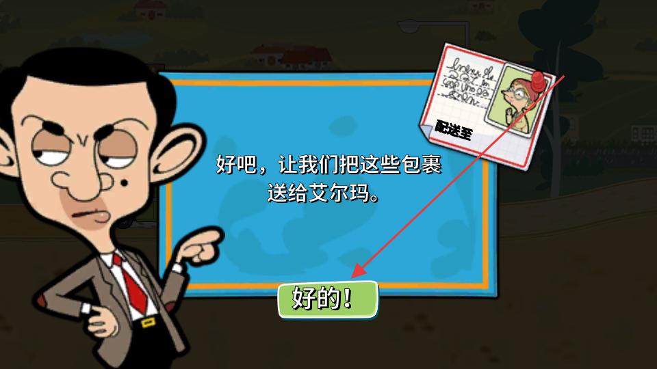 1、看到憨豆先生準備送包裹的提示,點擊好的按鈕,接受送包裹給艾爾瑪的任務,此時注意任務的目標,為后續送貨做準備。