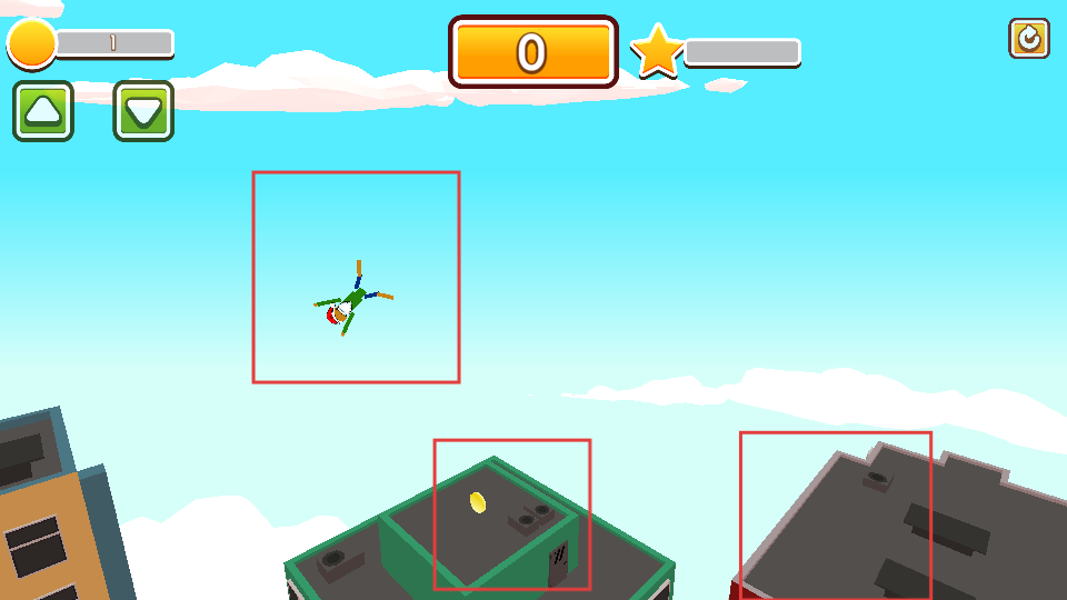3、角色在空中時,調整姿態,控制跳躍軌跡,爭取落在有金幣的樓頂上,每成功落在樓頂,就能收集到金幣,積累分數。