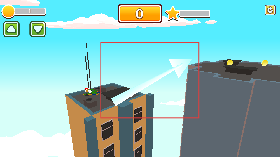 2、滑動屏幕,讓角色朝著目標樓頂跳躍,借助跳躍的力量,飛向有金幣的樓頂,盡量精準落在目標位置,收集金幣。