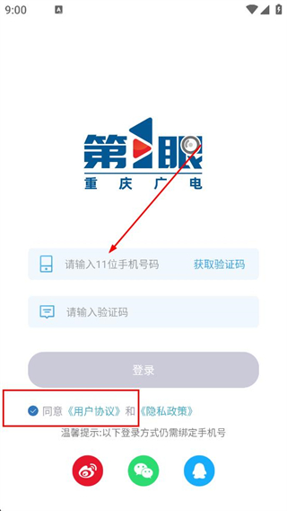 1、打開第1眼新聞APP,進入登錄頁面勾選同意用戶協議和隱私政策,輸入框填寫11位手機號碼,點擊獲取驗證碼,輸入收到的驗證碼后點擊登錄。
