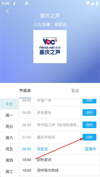 3、在重慶之聲頁面查看節目單找到已結束的節目,點擊對應節目右側的回聽按鈕,即可收聽該節目的回放內容,也可查看正在直播的節目。