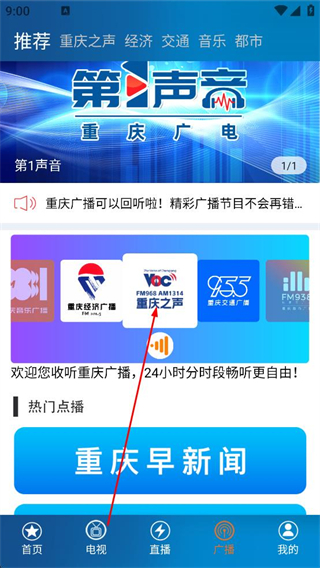 2、登錄后進入首頁選擇重慶之聲板塊,在展示的廣播頻道中找到重慶之聲選項,點擊進入該頻道的專屬頁面,查看相關廣播內容。