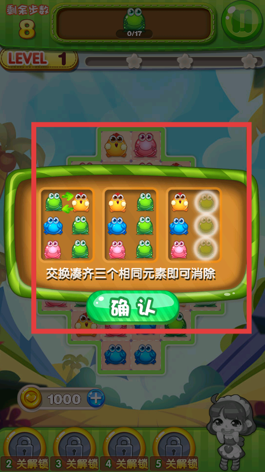 1、點擊開始游戲,進入LEVEL1,界面會提示交換湊齊三個相同元素即可消除,點擊確認,開始進行消除操作。