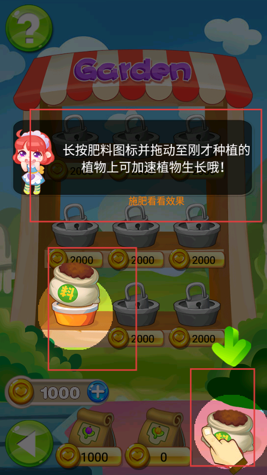 4、完成消除關卡后,可進入花園界面,長按肥料圖標并拖動至種植的植物上,能加速植物生長,助力植物培育。