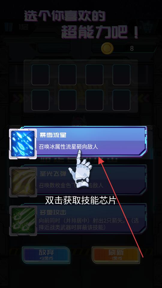 3、戰斗過程中會出現超能力選擇界面,雙擊暴雪流星選項,獲取該技能芯片,讓角色擁有召喚冰屬性流星砸向敵人的能力。