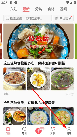 1、菜譜頁面可瀏覽最新美食內容,如貼秋膘相關溫熱食物推薦、北方早餐等菜譜,點擊底部我的可進入個人中心頁面。