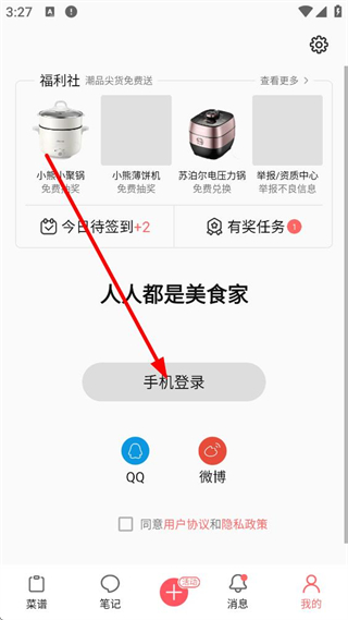 2、個人中心有福利可參與免費抽獎兌獎,還有今日待簽到和有獎任務,需先通過手機QQ或微博登錄,登錄前要同意用戶協議。