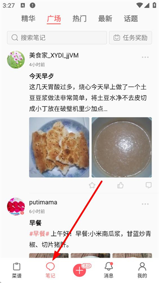 4、點擊底部筆記進入廣場頁面,可查看其他用戶分享的美食筆記,包含做法及成品圖,還能參與話題互動或搜索筆記內容。