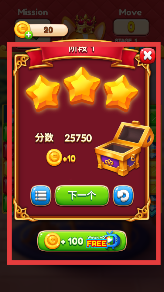 4、關卡結束后,會顯示獲得的星星數量、分數和金幣獎勵,若對結果滿意,點擊下一個按鈕進入下一關,繼續新的消除挑戰。