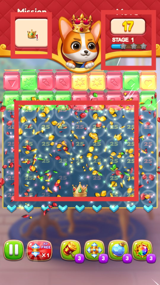 3、消除方塊時會有特效和獎勵,界面會顯示剩余步數,要在規定步數內完成消除任務,同時還有皇冠等目標需要達成,推動關卡進度。