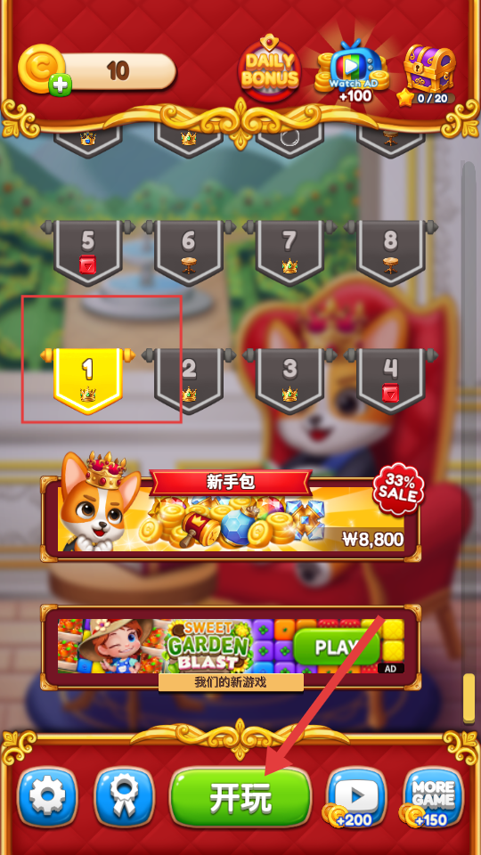 1、進入游戲主界面,選擇關卡1,點擊開玩按鈕,準備開始消除方塊的挑戰,界面上方能看到金幣數量和每日獎勵等入口,為游戲做好準備。