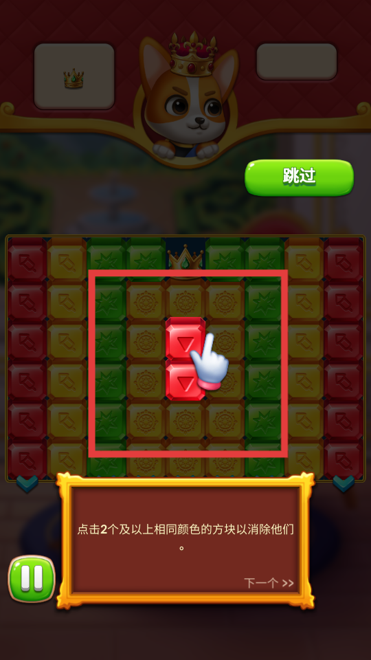 2、在關卡中點擊2個及以上相同顏色的方塊,就能消除它們,按照提示操作,熟悉消除的基本規則,開啟消除的第一步。