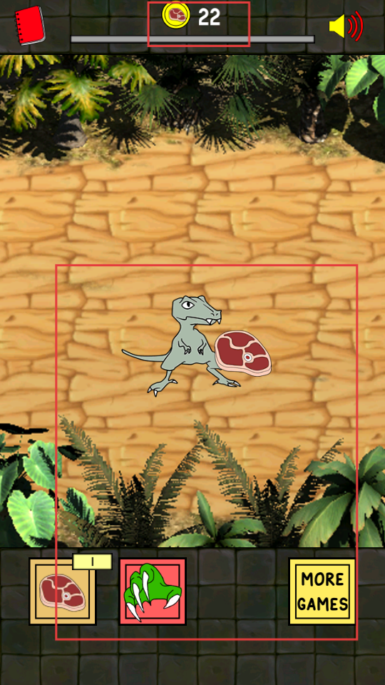 4、完成一定任務后進入新關卡,按照提示左右移動恐龍,繼續在場景中捕獵,獲取肉塊,推進游戲進程。