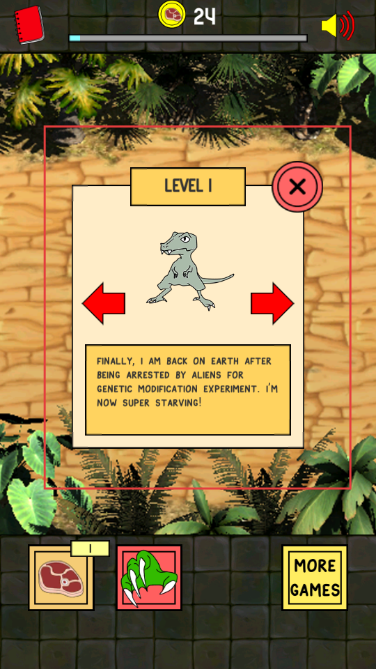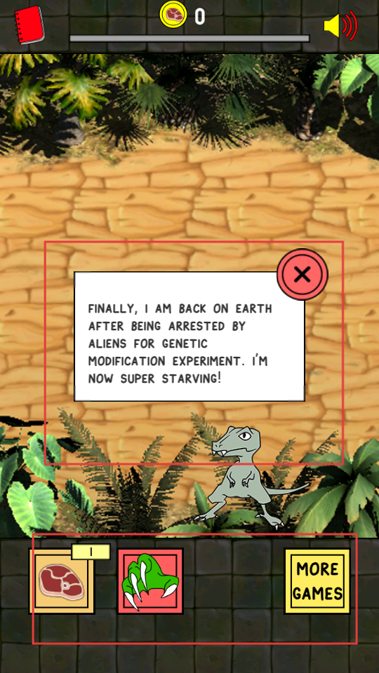 1、進入游戲,了解背景故事,恐龍回到地球后很餓,點擊相關按鈕,開始為恐龍尋找食物,準備進行捕獵等操作。