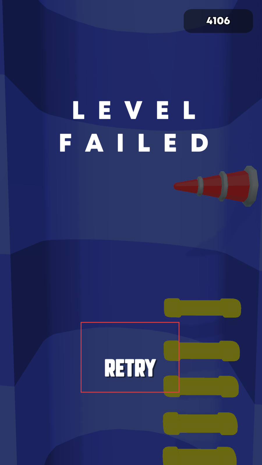 4、如果在游戲中因碰撞等原因導致關卡失敗,出現LEVEL FAILED界面時,點擊RETRY按鈕,可重新挑戰當前關卡。