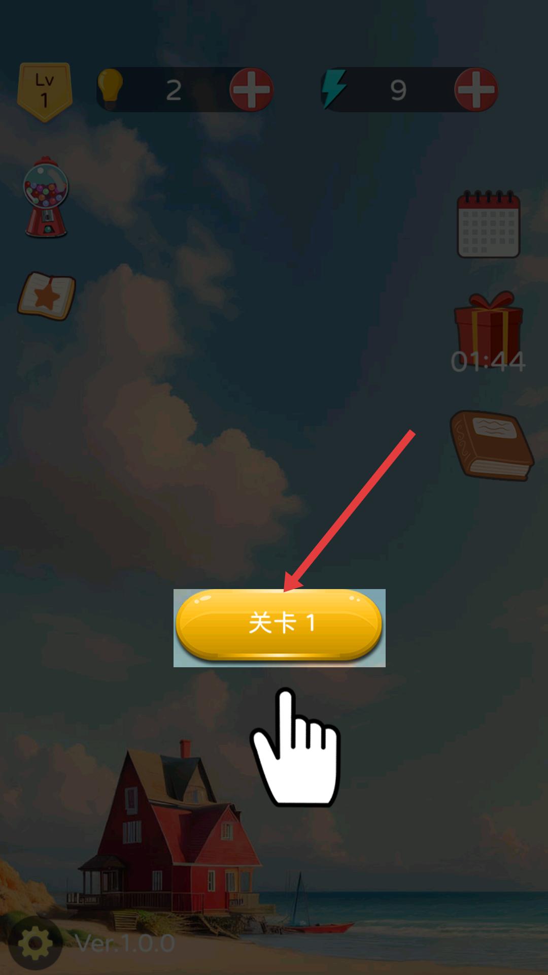 1、游戲初始界面,點擊關卡1按鈕,即可進入第一關,開啟找不同的游戲挑戰,準備觀察對比畫面。