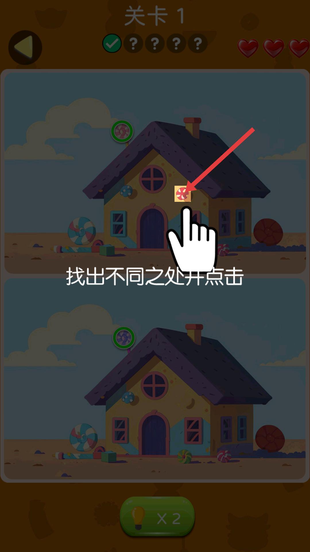 2、進入關卡1后,仔細對比上下兩幅房屋的畫面,找出不同之處,按照提示點擊不同的元素,完成找不同任務。