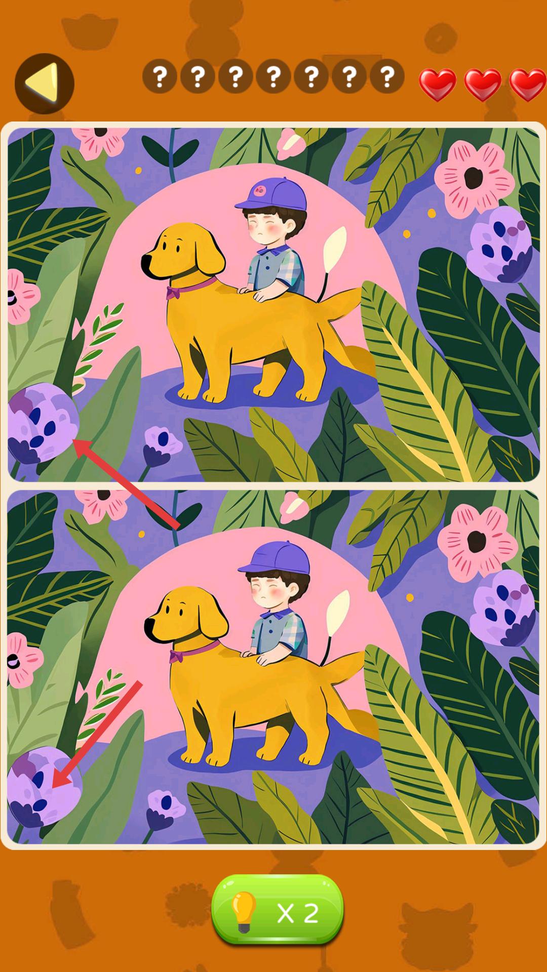3、后續關卡,面對有男孩和狗的畫面,同樣認真對比上下圖,留意花朵等細節部分的差異,精準點擊不同之處。