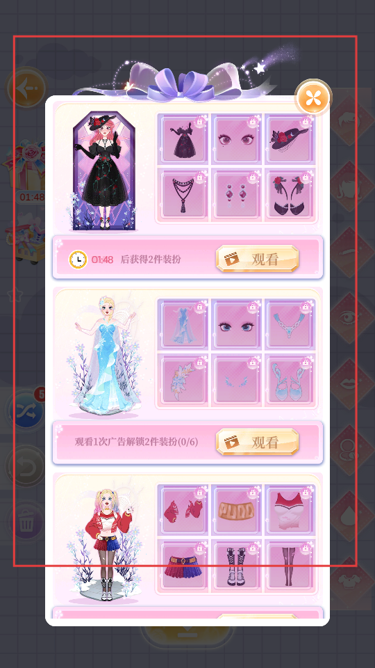 1、進入游戲主界面,能看到不同的裝扮套裝,可等待時間獲取裝扮,也能點擊觀看解鎖裝扮,為后續搭配做準備。