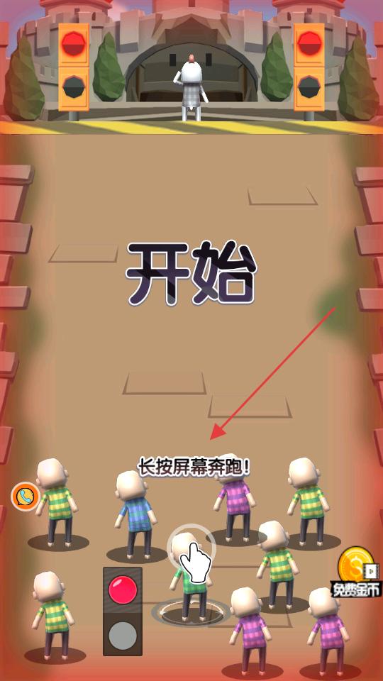 2、進入游戲后看到開始長按屏幕奔跑的提示,長按屏幕讓迷你人類角色開始奔跑,朝著目標方向前進,同時注意周圍環境。