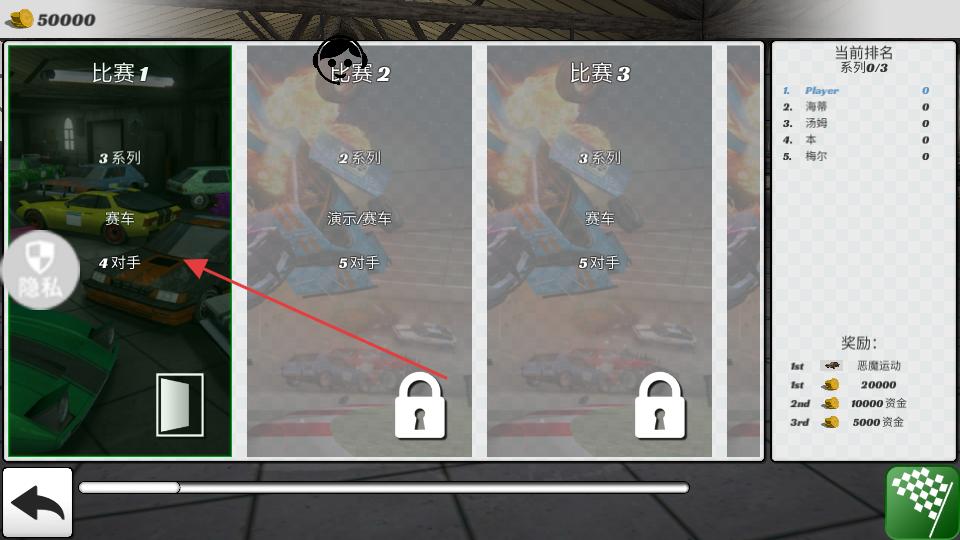 2、在比賽選擇界面選擇比賽1,該比賽為3系列賽車比賽,有4個對手參與,點擊后進入賽車準備階段,即將開始比賽。