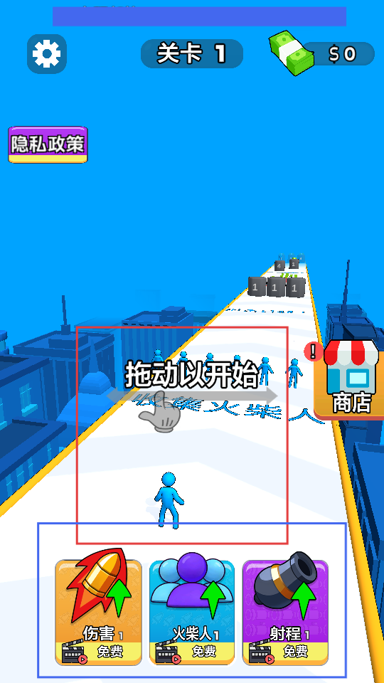 1、進入游戲,在關卡界面,看到拖動以開始提示,拖動角色,就能開啟游戲進程,同時可查看傷害、火柴人數量等屬性。