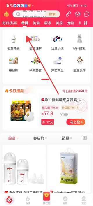 4、切換到母嬰分類查看嬰童喂養、嬰童洗護、玩具玩偶等品類,了解采丫蔓越莓紙尿褲等母嬰商品的規格與價格,以便挑選適合的母嬰用品。