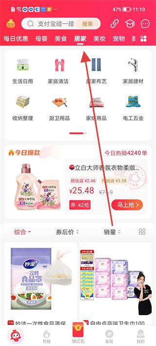 2、切換到居家分類查看生活日用、家庭清潔、家居布藝等品類,了解立白大師香氛衣物柔順劑等居家商品的價格與銷量。