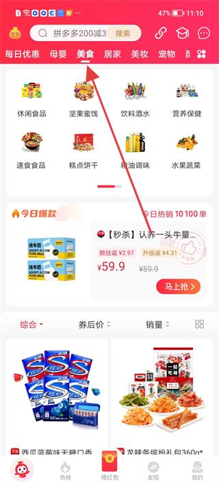 3、再切換到美食分類查看休閑食品、堅果蜜餞、飲料酒水等品類,了解認養一頭牛牛奶等美食商品的秒殺活動與優惠力度。
