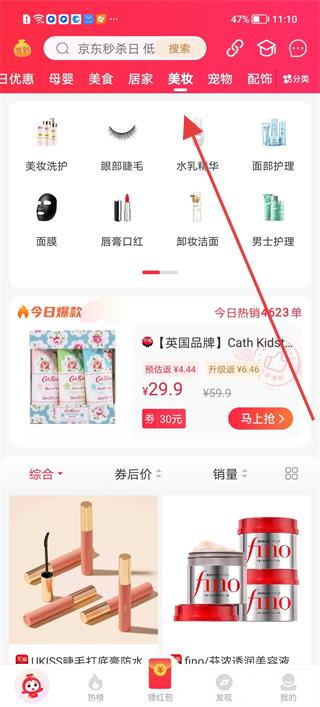 1、點擊美妝分類,查看美妝洗護、眼部睫毛、水乳精華等細分品類,瀏覽今日爆款商品,了解美妝類商品的優惠信息。