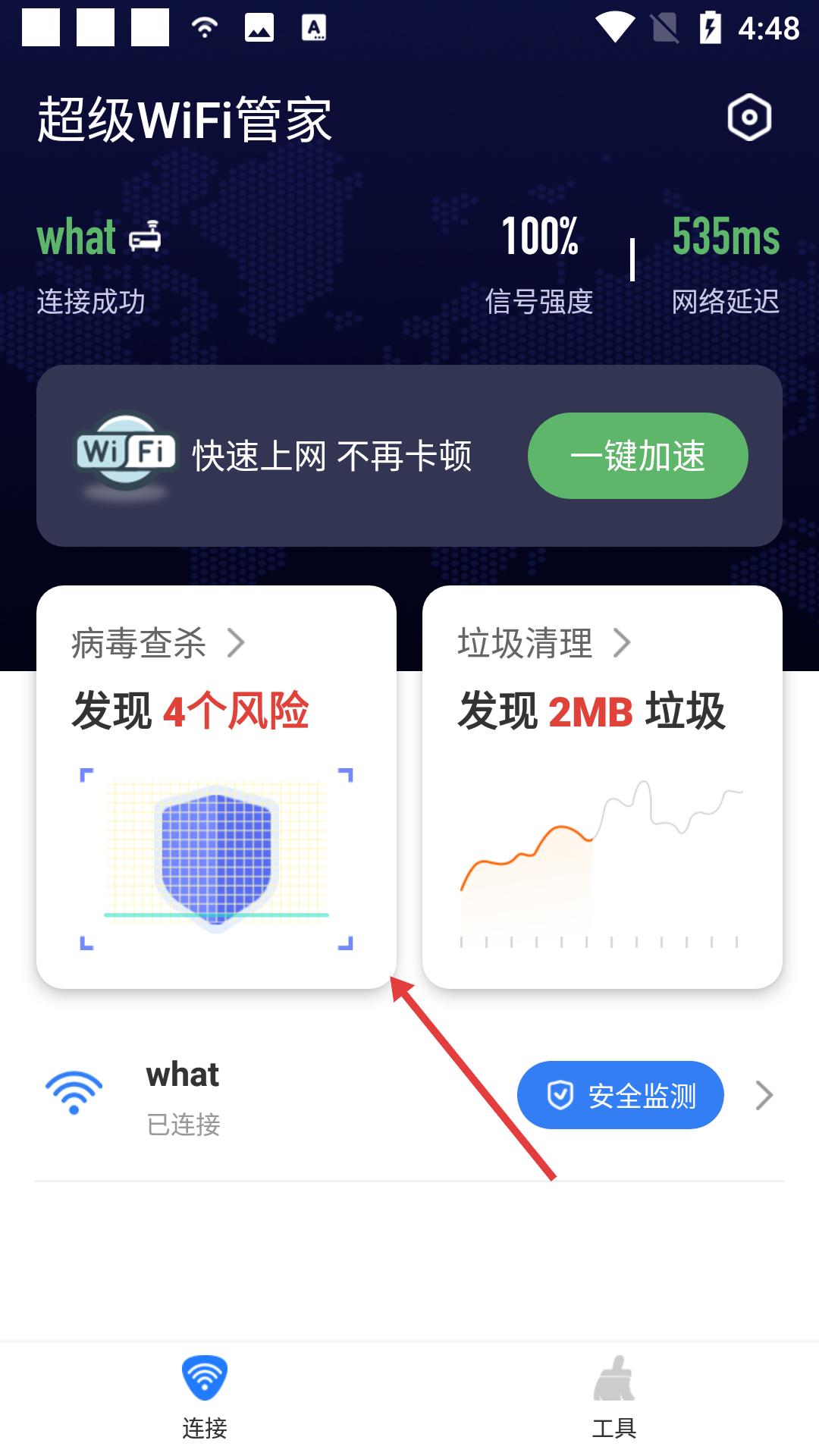 1、超級WiFi管家APP顯示WiFi連接成功,顯示信號強度,網絡延遲,可進行病毒查殺和垃圾清理,保障網絡安全。