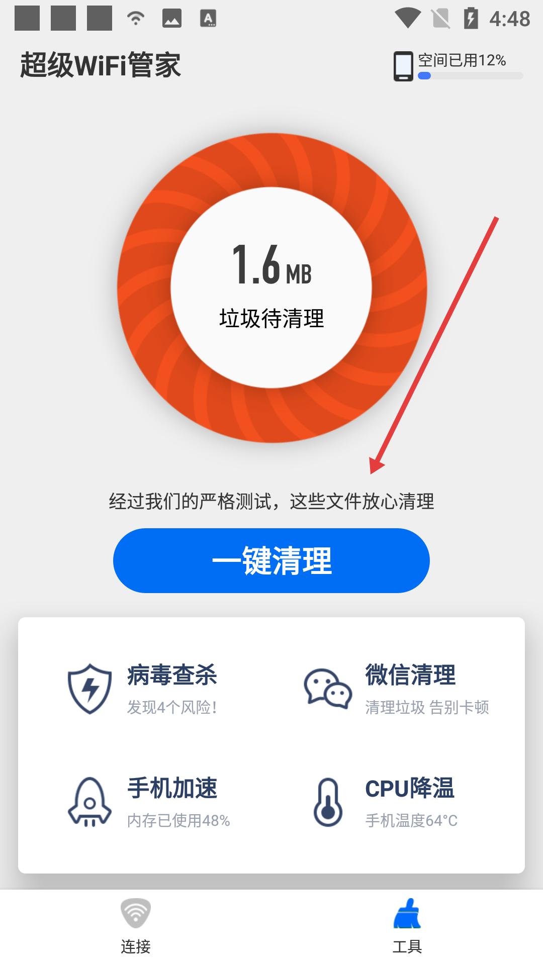 2、超級WiFi管家APP的工具頁面顯示有垃圾待清理,可一鍵清理,還有病毒查殺、微信清理等功能,優化手機網絡。