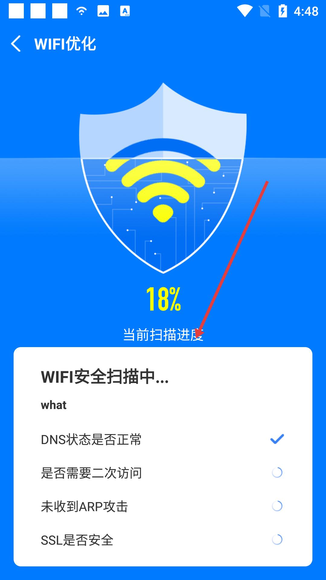 3、超級WiFi管家APP的WiFi優化頁面顯示掃描進度,正在進行WiFi安全掃描檢查DNS狀態等網絡安全情況。