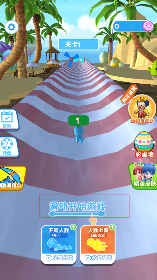 1、玩家下載游戲之后在游戲初始界面,按照滑動開始游戲的提示,在屏幕上滑動,操控小人開始在水上冒險樂園的賽道上前進。