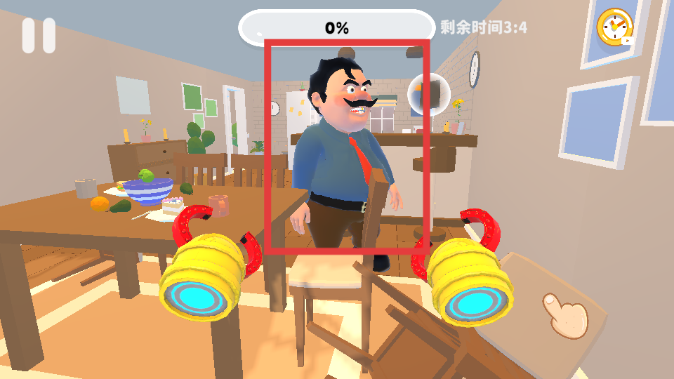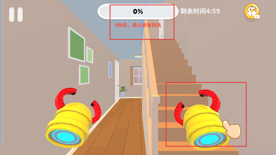 2、游戲開始后,會有剩余時間和進度顯示,還會提示黑心老板到達的倒計時,操控帶有紅色部件的黃顏色裝置,在場景中進行操作。