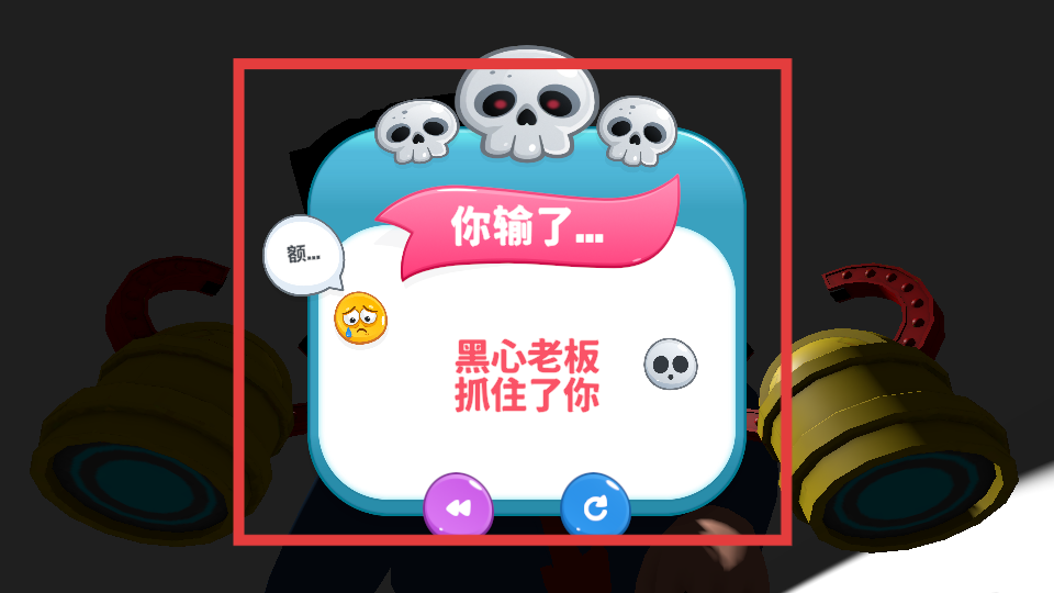 4、如果被黑心老板抓住游戲就會失敗,屏幕會顯示你輸了黑心老板抓住了你,此時可點擊紫色返回按鈕或藍色重玩按鈕,選擇后續操作。