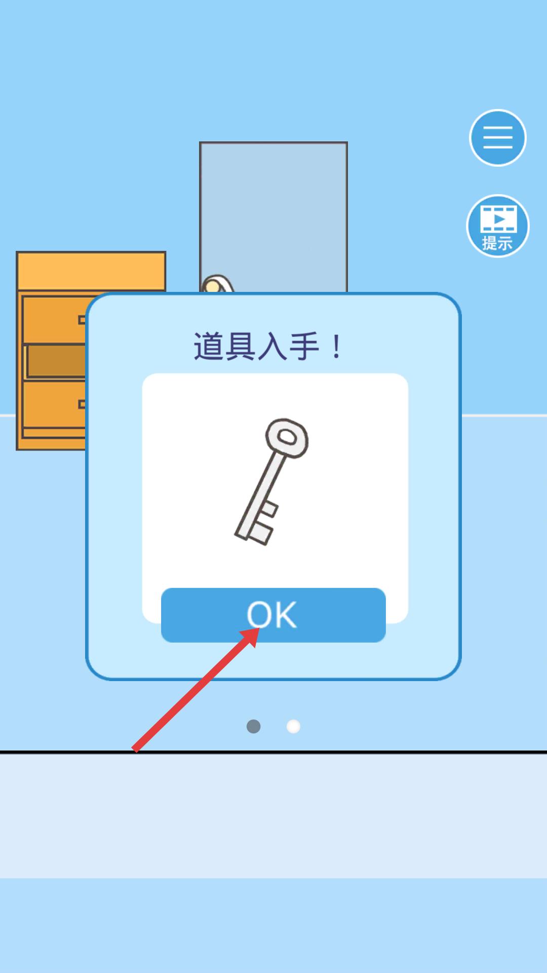3、打開抽屜后,若獲得鑰匙道具,會彈出道具入手提示框,點擊OK按鈕,確認獲得鑰匙,為打開門鎖做準備。