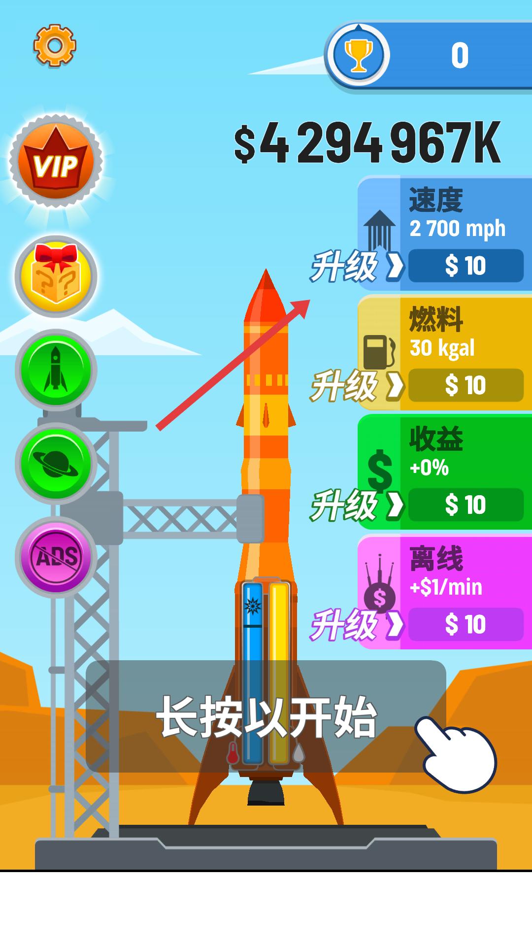 1、在游戲界面,可查看火箭的速度、燃料、收益等屬性,若有足夠資金,點擊升級能提升這些屬性,助力火箭更好飛行。