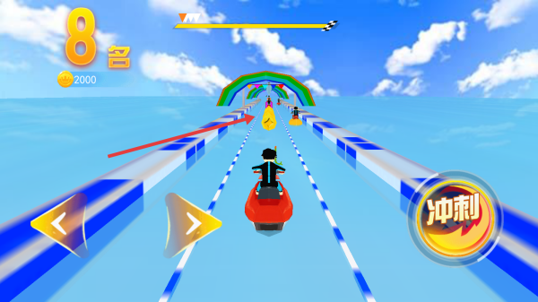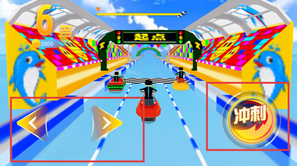 3、進入賽道后,利用屏幕左下角的左右方向按鈕控制水上摩托的轉向,點擊屏幕右下角的沖刺按鈕超越對手。