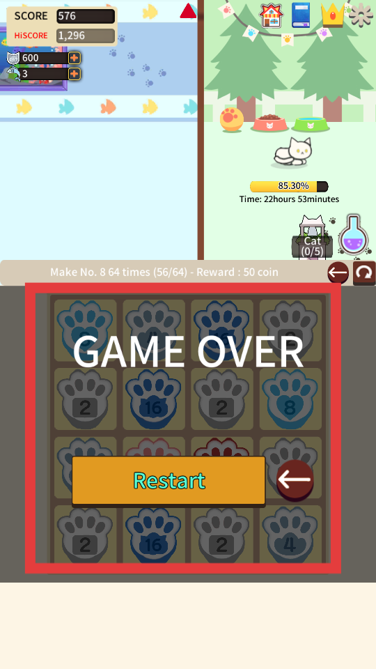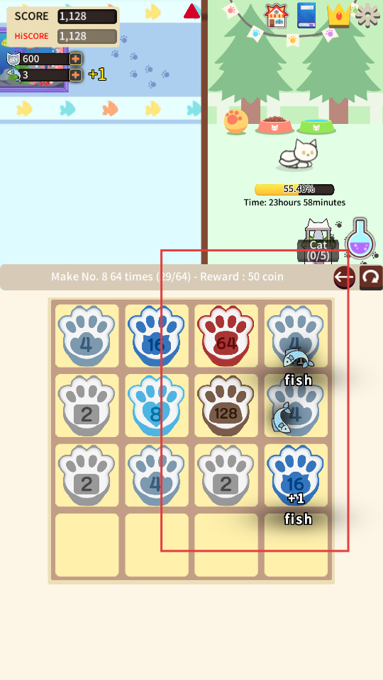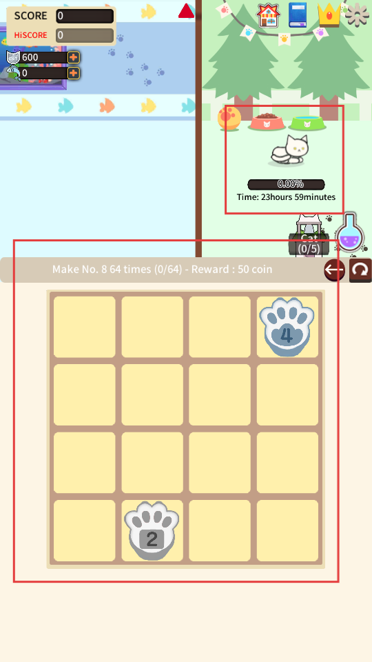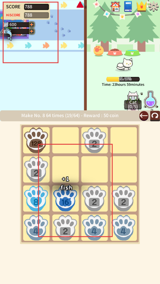 2、持續移動方塊,使更多相同數字的爪印方塊合并,每次合并分數會增加,同時注意方塊的分布。