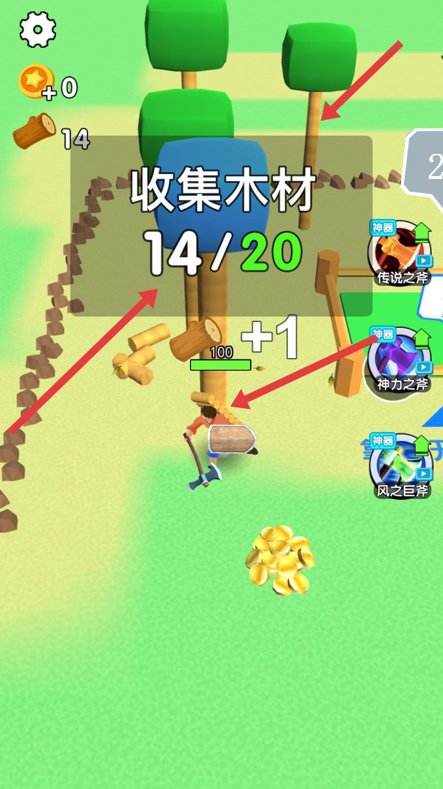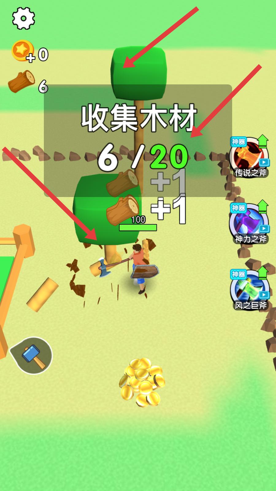 2、操控角色用斧頭砍樹,每砍一次能獲得木材,游戲界面會顯示收集木材的進度。