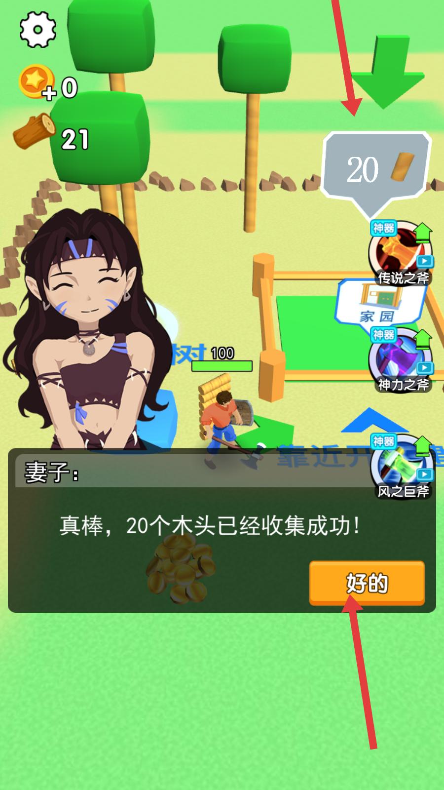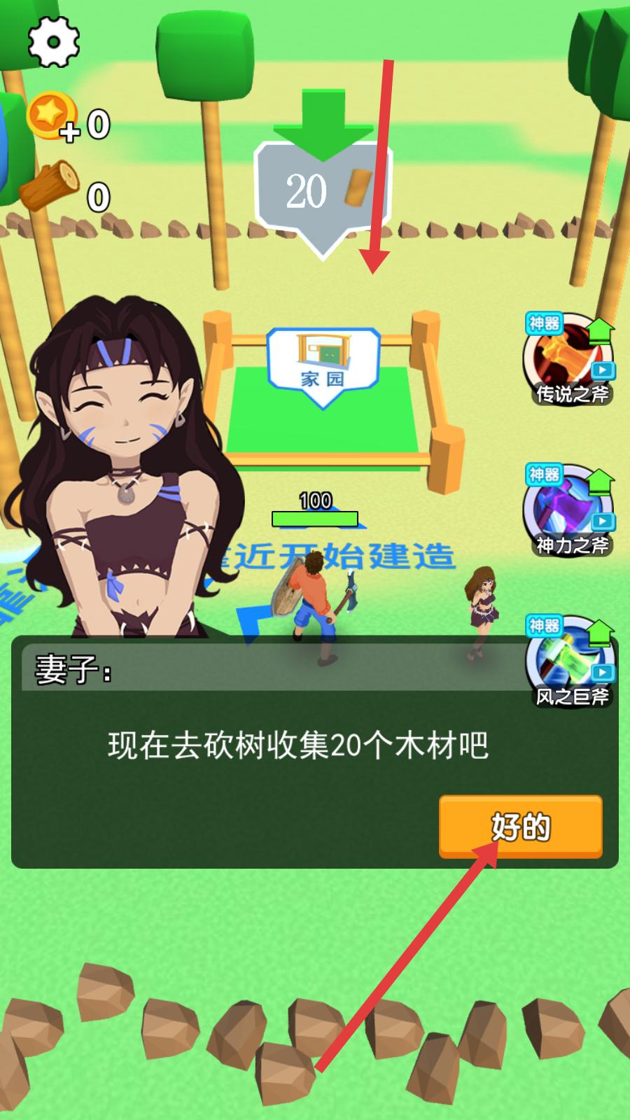 1、游戲開始,妻子會提示去砍樹收集20個木材,點擊好的,正式開啟收集20個木頭的伐木任務。